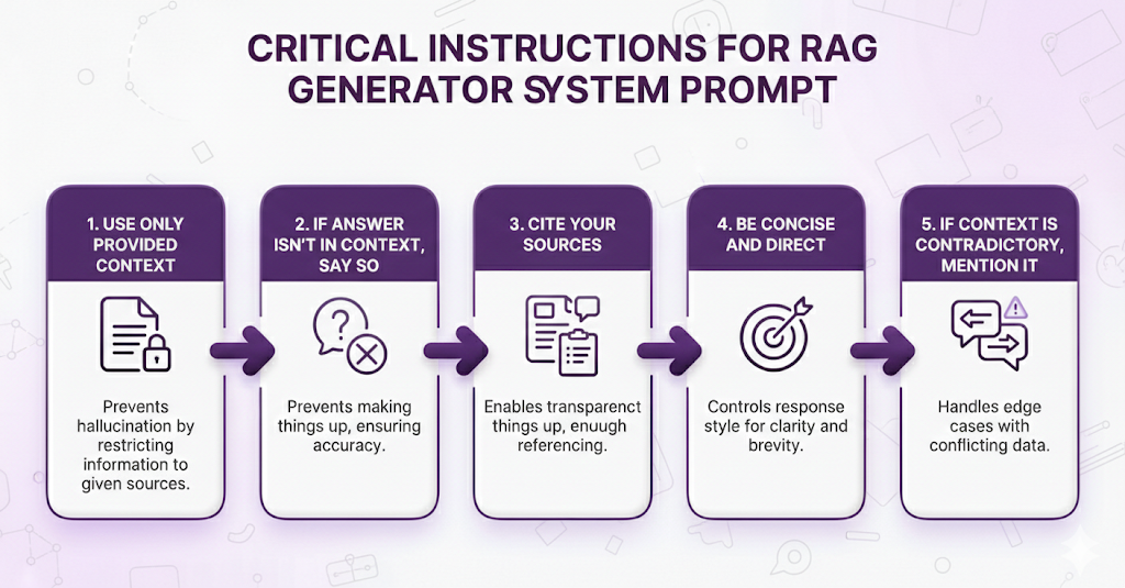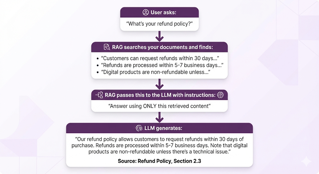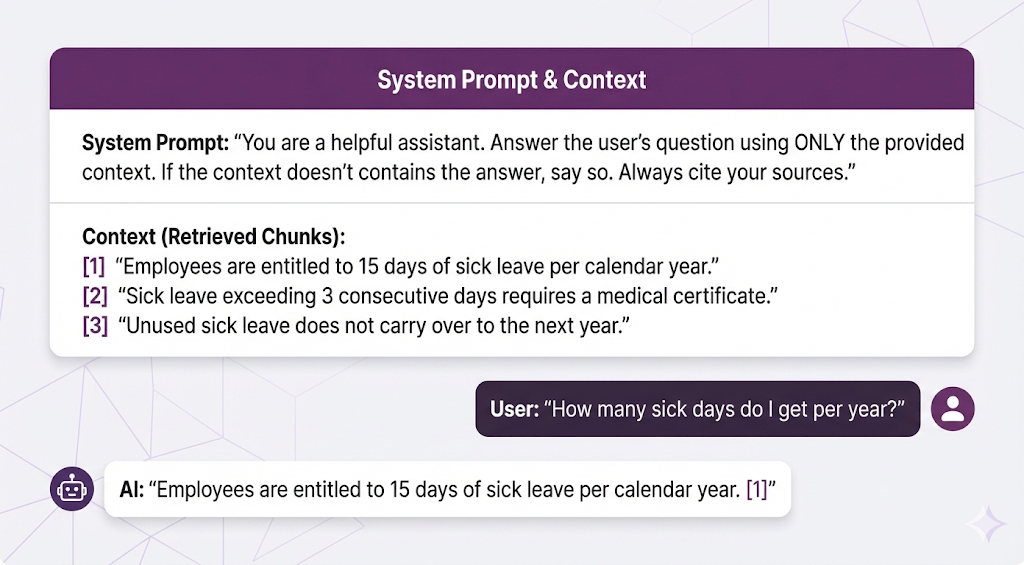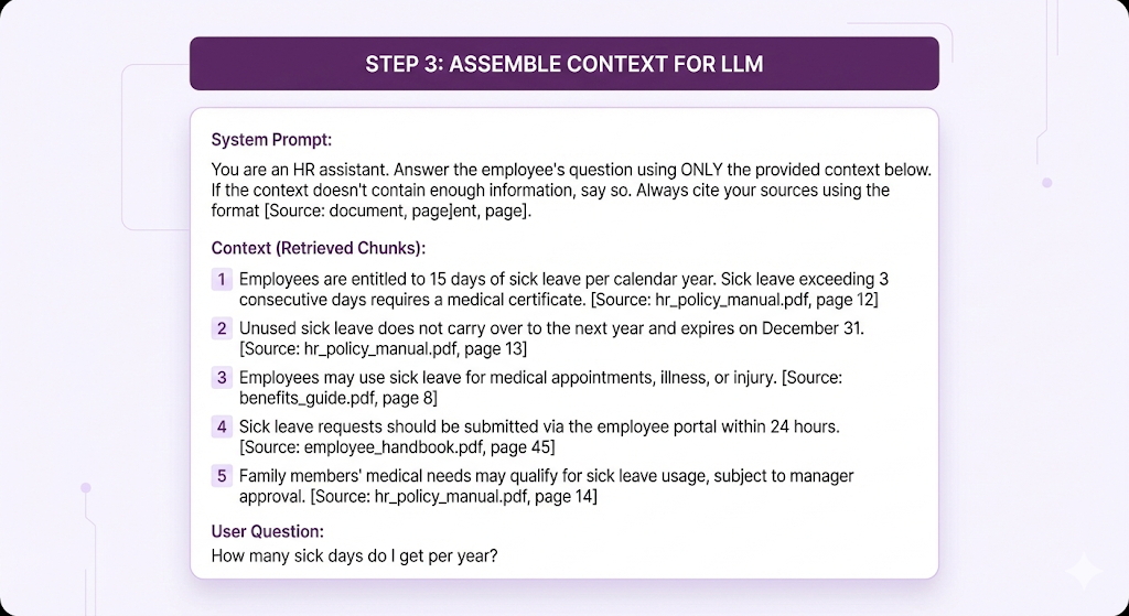 - It tells the LLM: "Here's the user's question, and here's the related content. Answer the question using only this content."