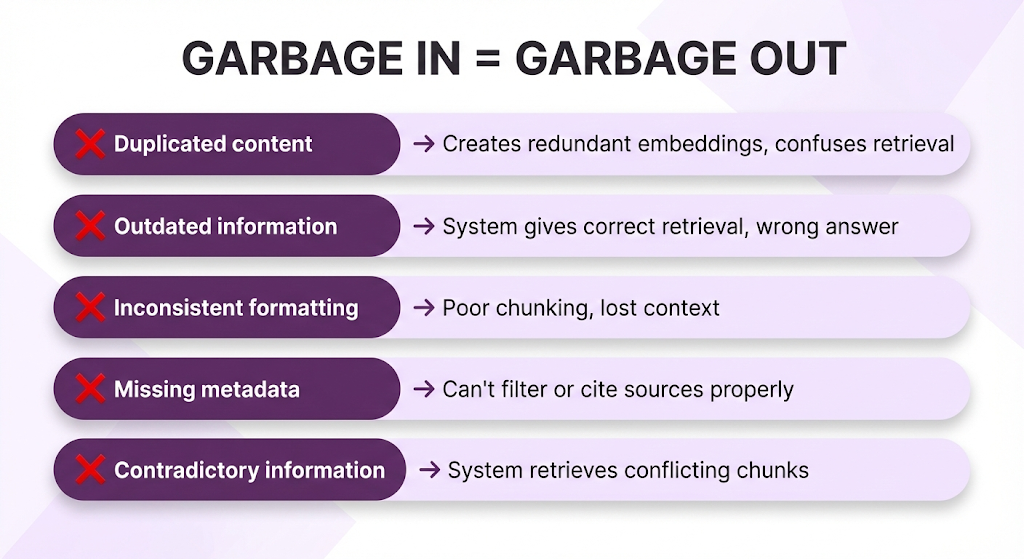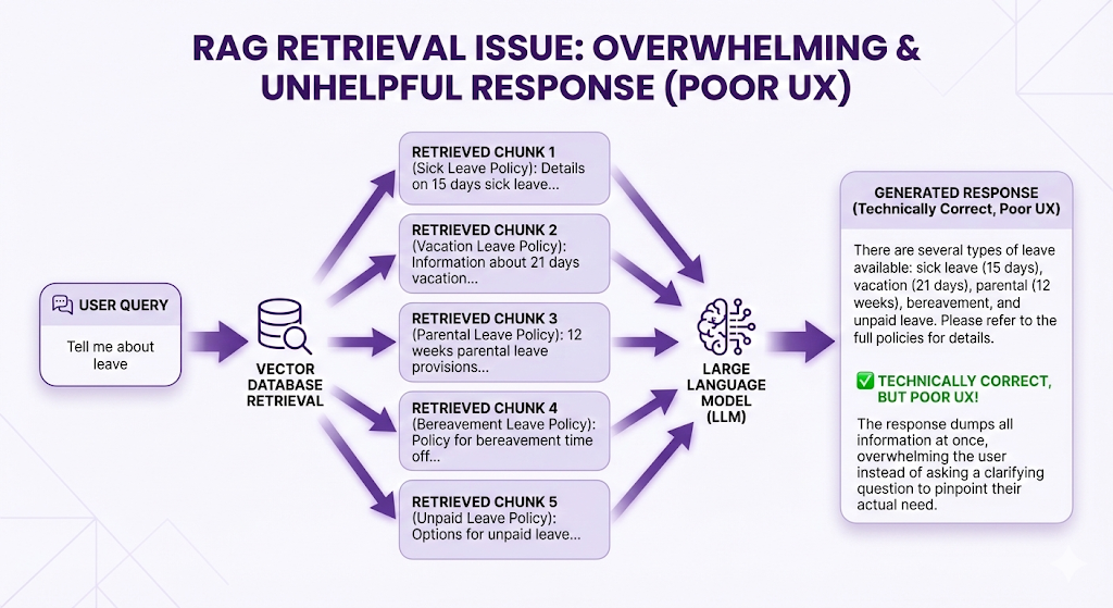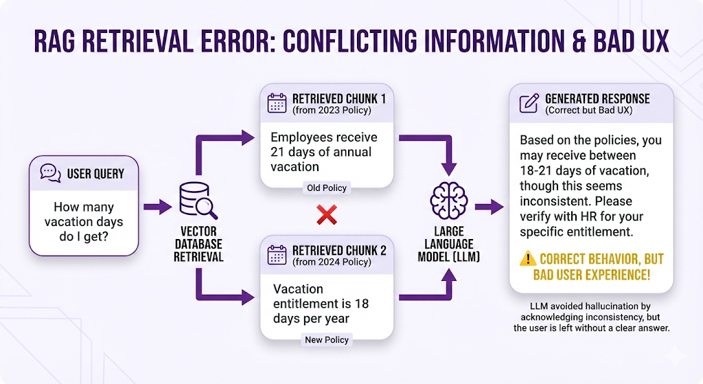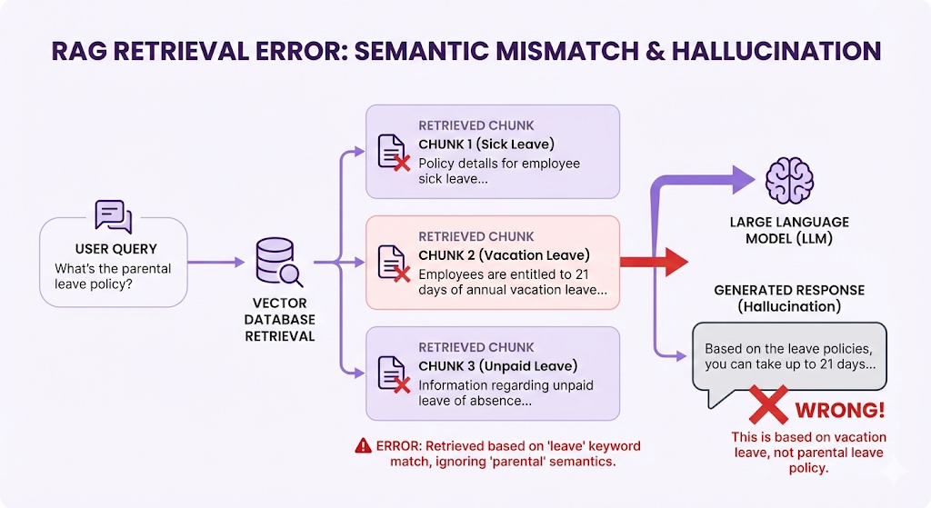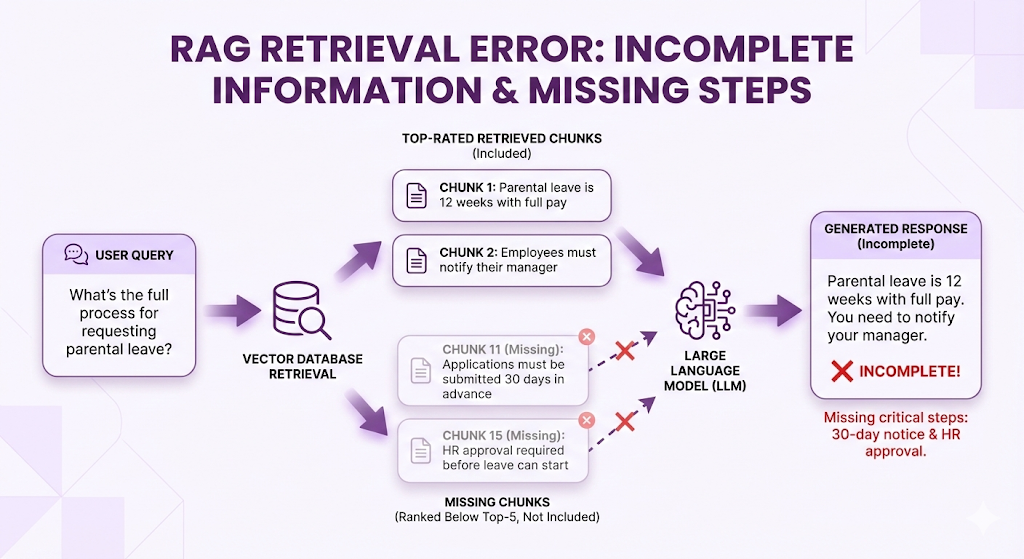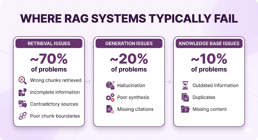 - Retrieval (wrong chunks, incomplete info, contradictions)