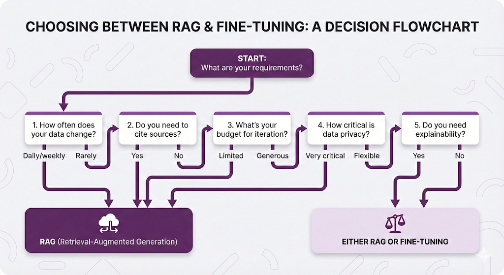 RAG is the right choice when your data changes frequently think daily or weekly updates rather than static content. It's particularly valuable when you need source attribution for compliance, legal, or medical applications where every claim must be traceable. If you're working with diverse data sources like documents, wikis, emails, and databases that all need to be searchable in one place, RAG handles this naturally. The approach also shines when you need fast iteration cycles for rapid prototyping and A/B testing, since you can modify your knowledge base and retrieval logic without retraining. For organizations where data privacy is critical and information must stay within company infrastructure, RAG keeps everything under your control. Finally, if explainability matters if you need to debug wrong answers and continuously improve your system RAG's transparent retrieval process makes this straightforward in ways that fine-tuning simply can't match.