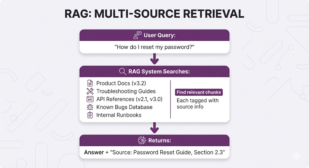 RAG handles this naturally each retrieved chunk includes its source, so agents know exactly where the information came from and can link customers directly to the relevant documentation.