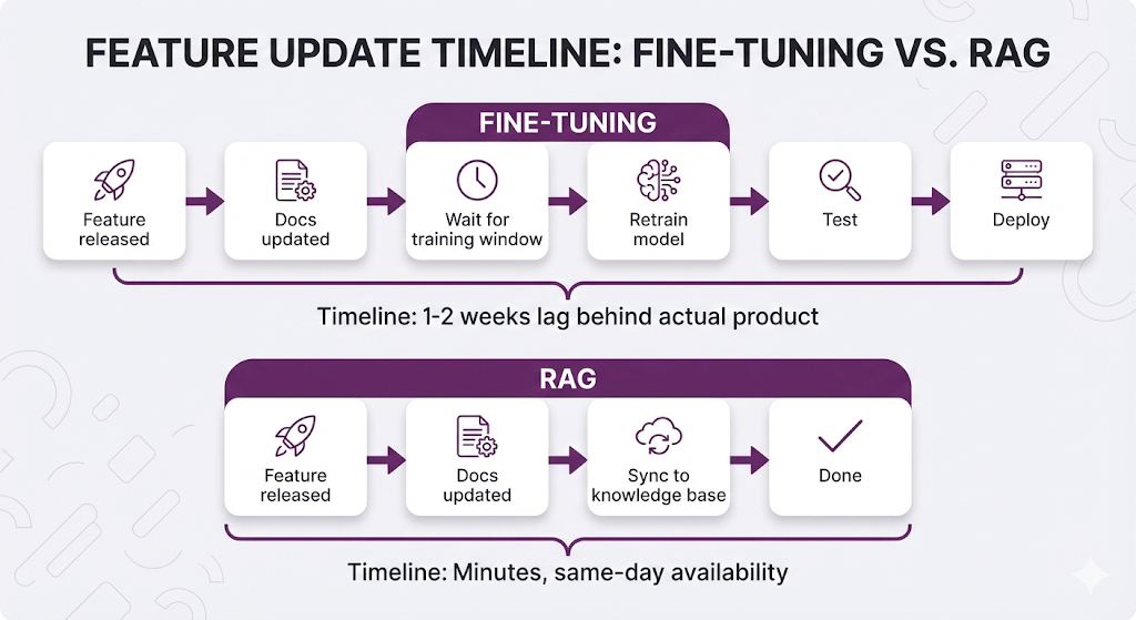 | Handle weekly product updates | ❌ Retraining cycle every release | ✅ Update docs instantly |
