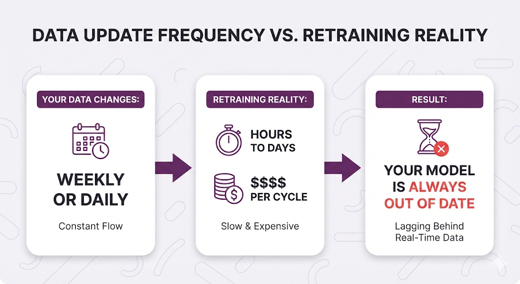 Every time your data changes, you need to retrain. For organizations with frequently updated information (policies, products, procedures), this creates a maintenance nightmare.