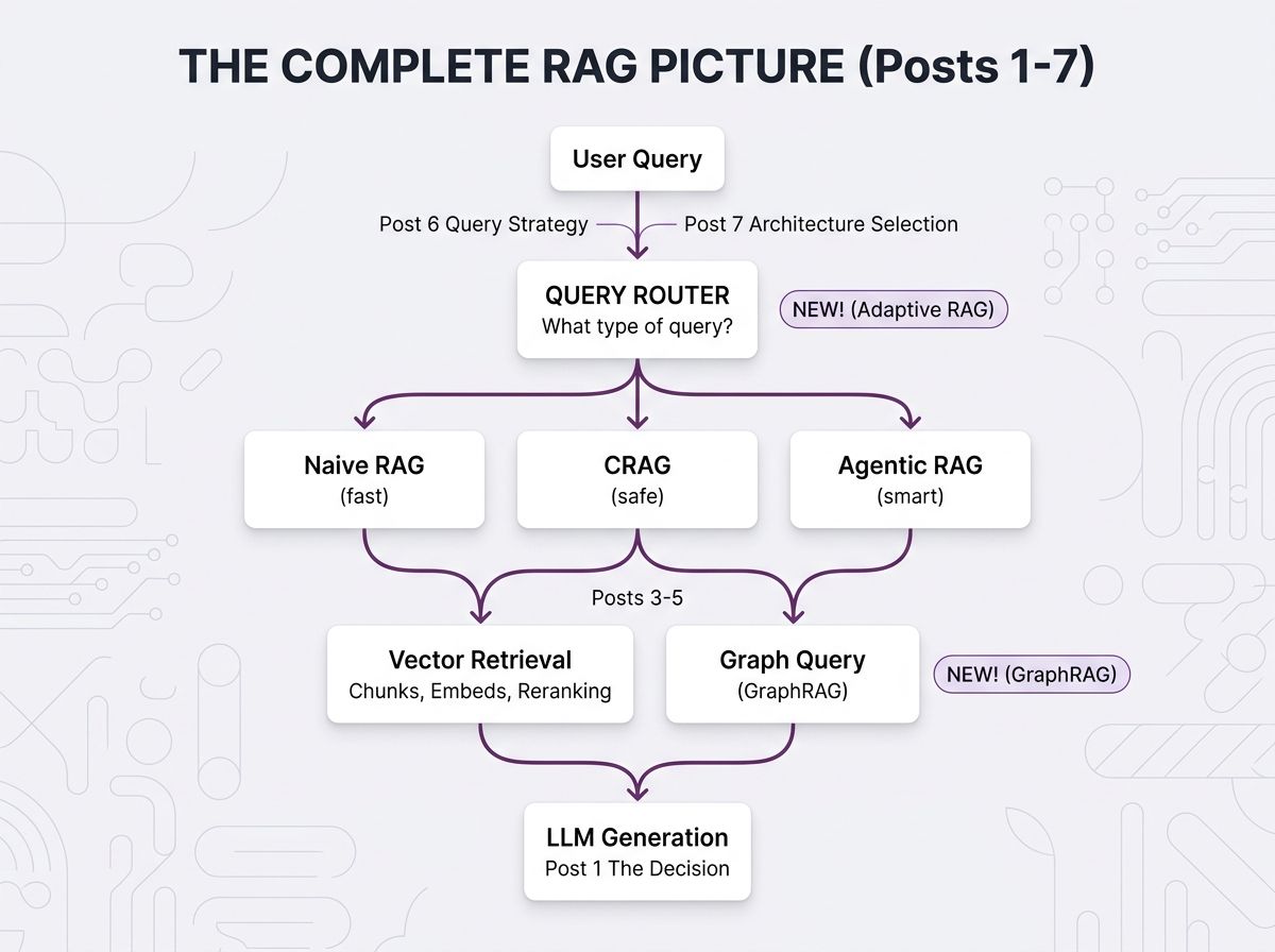 We've now covered the full spectrum of RAG architectures from the simplest retrieve-and-generate to agents that reason about what to search for and graphs that traverse pre-built connections.