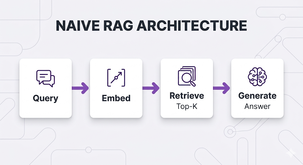 Naive RAG (also called "Basic RAG" or "Vanilla RAG") is the straightforward retrieve-then-generate pattern:
