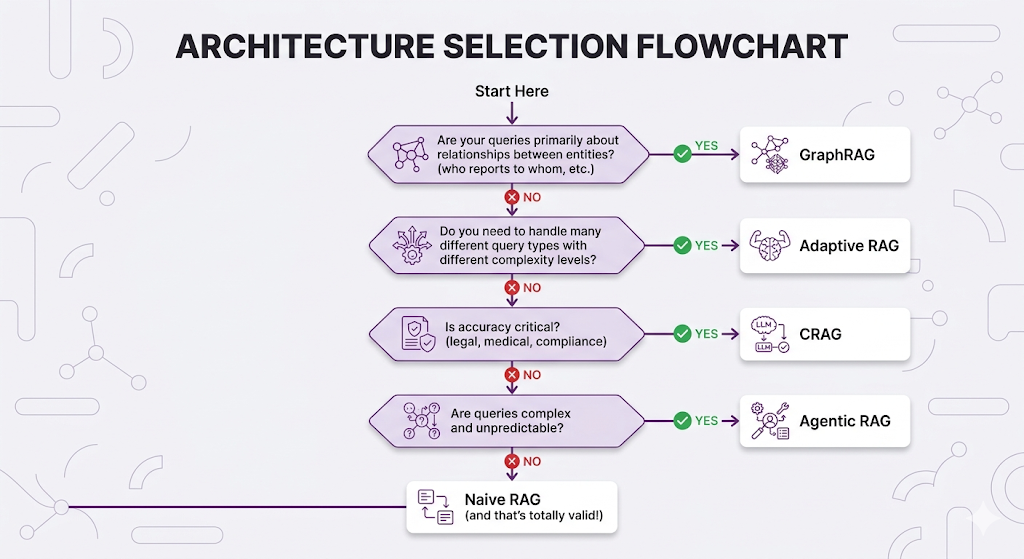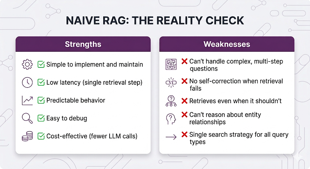 If your use case fits Naive RAG's strengths? Ship it. Seriously. Don't overcomplicate things when the simple approach works. The architectures we're about to cover exist for the cases where it doesn't work and knowing the difference is the whole game.