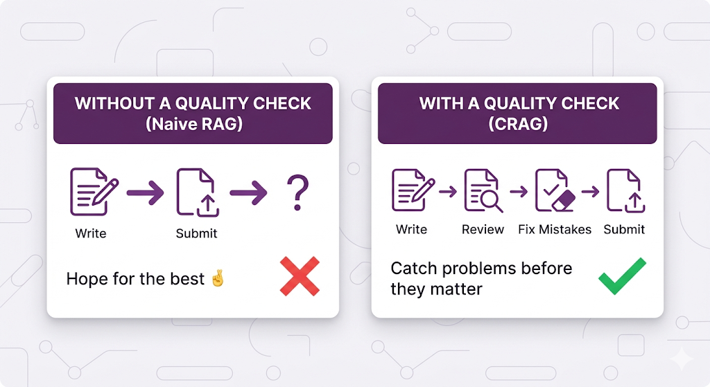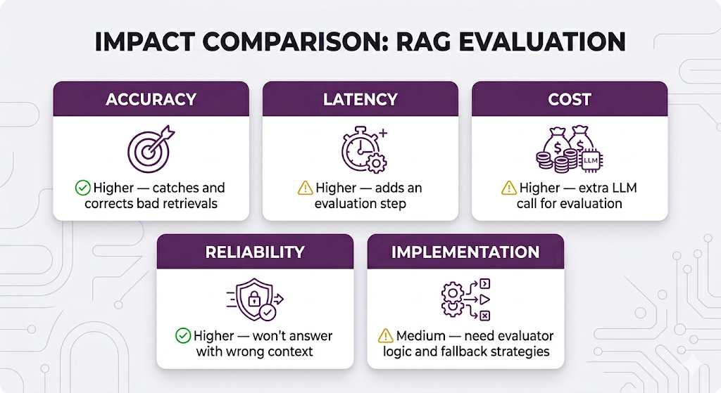 | Extra latency/cost | ❌ None | ⚠️ Adds evaluation + potential re-retrieval |