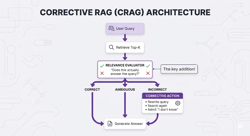 Corrective RAG (CRAG) adds a quality-check step: after retrieval, evaluate whether the retrieved content is actually relevant before using it. If it's not, take corrective action.