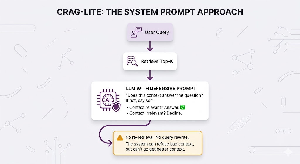 information that isn't in the provided context."And honestly? This works. Like, actually works. For a lot of teams, this is the right first move and it covers roughly 80% of what CRAG gives you. We'll call this CRAG-lite.