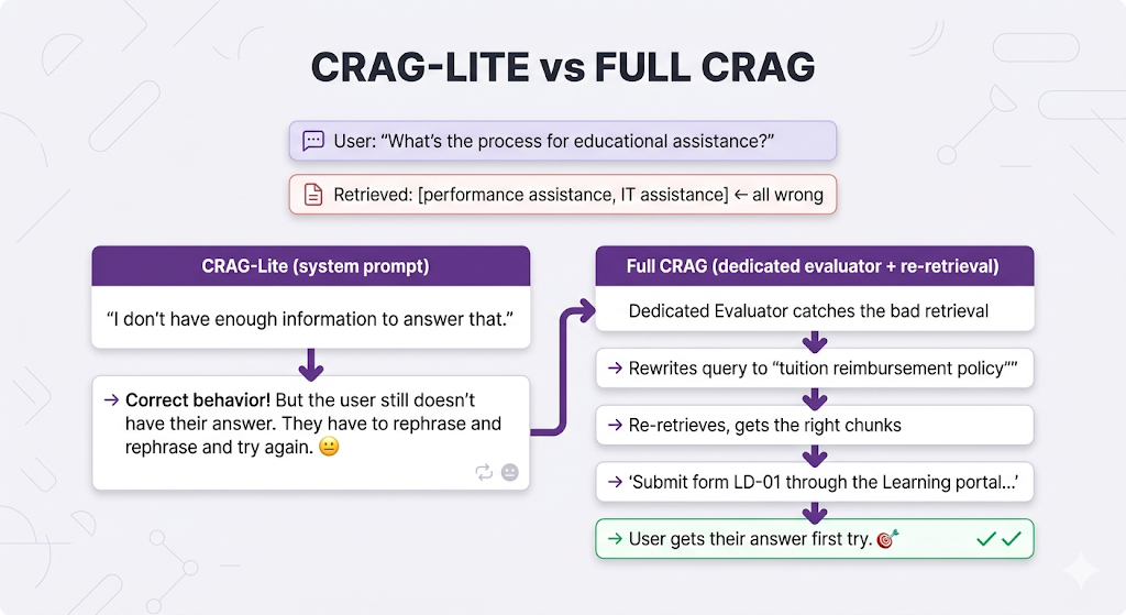 | Capability | CRAG-Lite (System Prompt) | Full CRAG (Evaluator) |