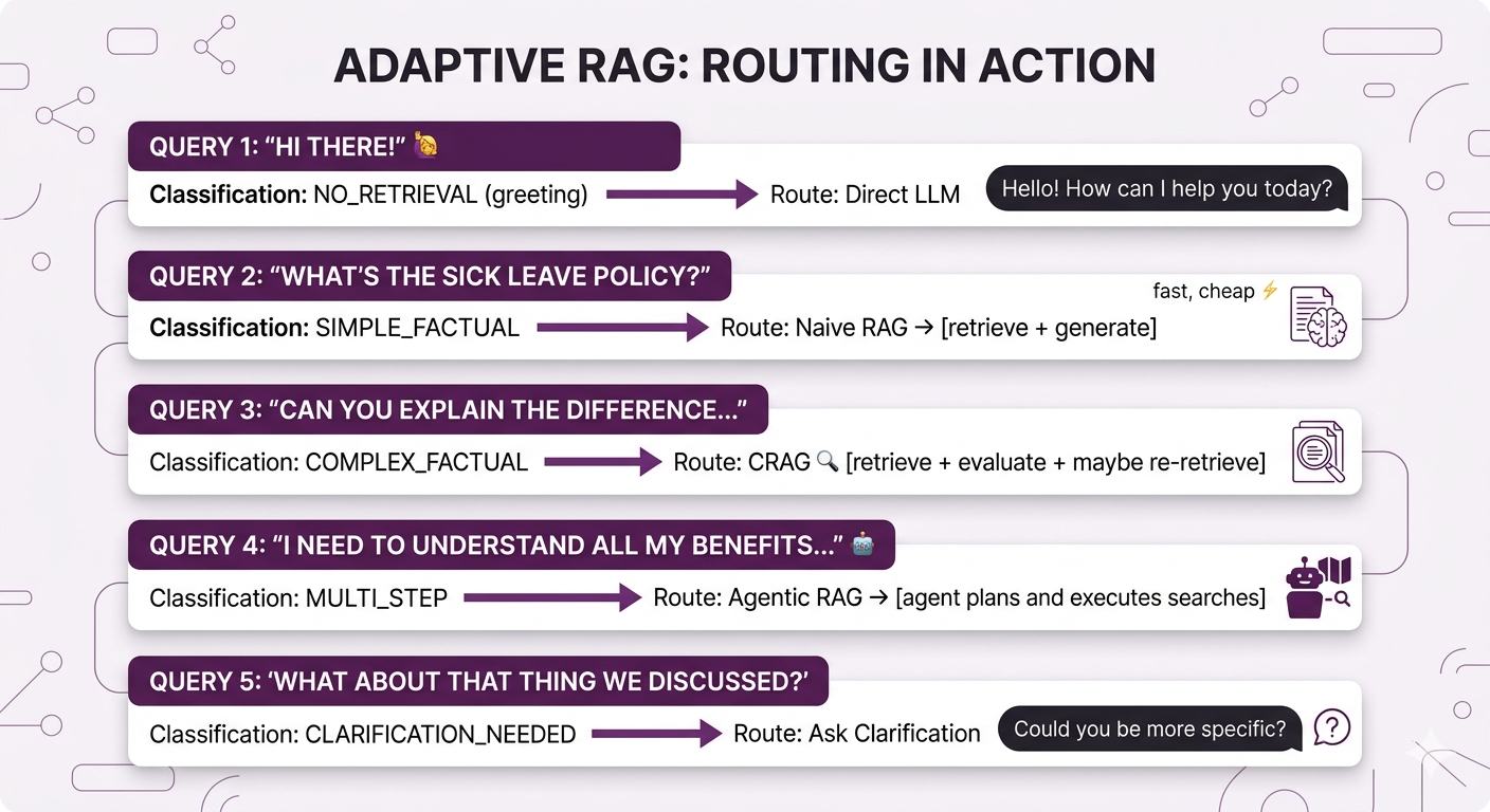| Production HR Bot | Adaptive RAG | Mix of simple and complex queries |