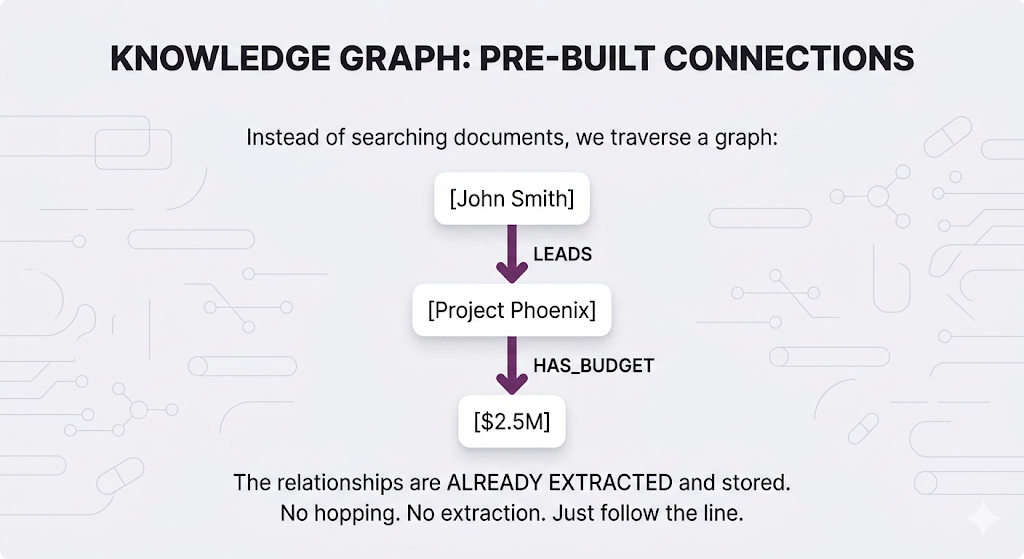 | Need entity relationships | GraphRAG | Connection traversal |